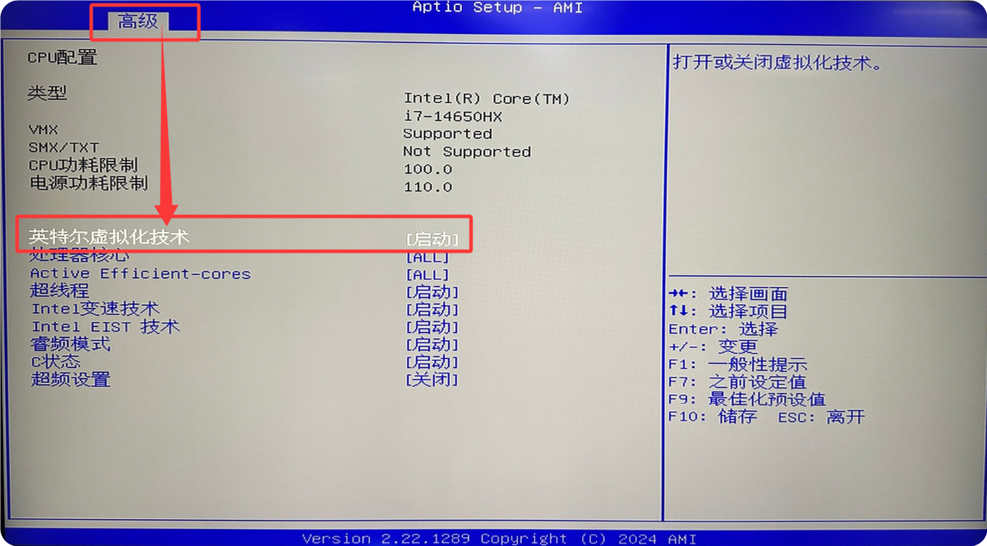 在主板bios,移动选择到“高级”栏目上,即可看到“英特尔虚拟化技术”选择开启。(一般该设置默认为开启状态)