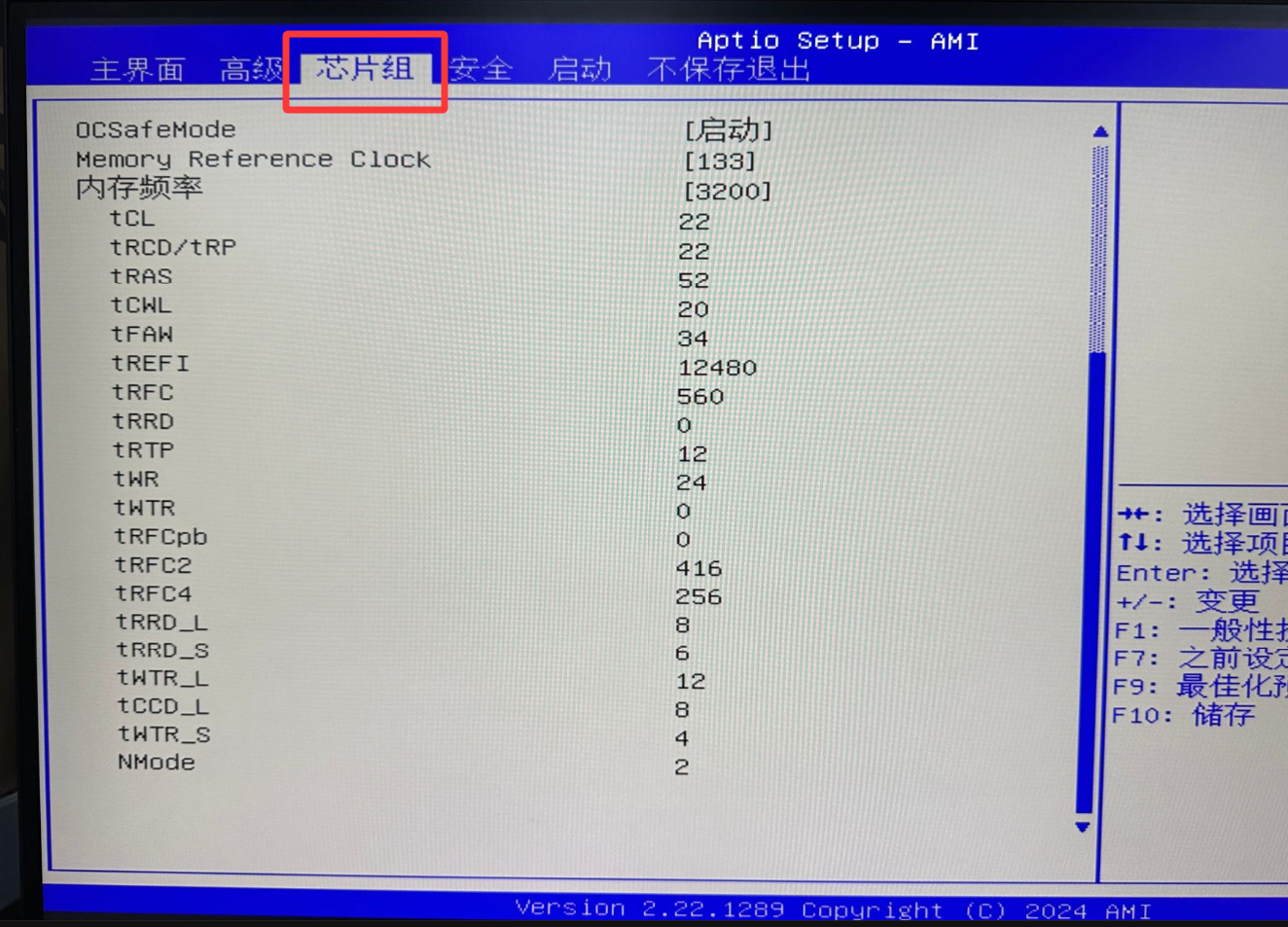 1.开机进入主板bios,移动选择到“芯片组”栏目上。(电脑在关机状态下,按开机键的一瞬间,不停点击键盘的del键,可进入bios)
