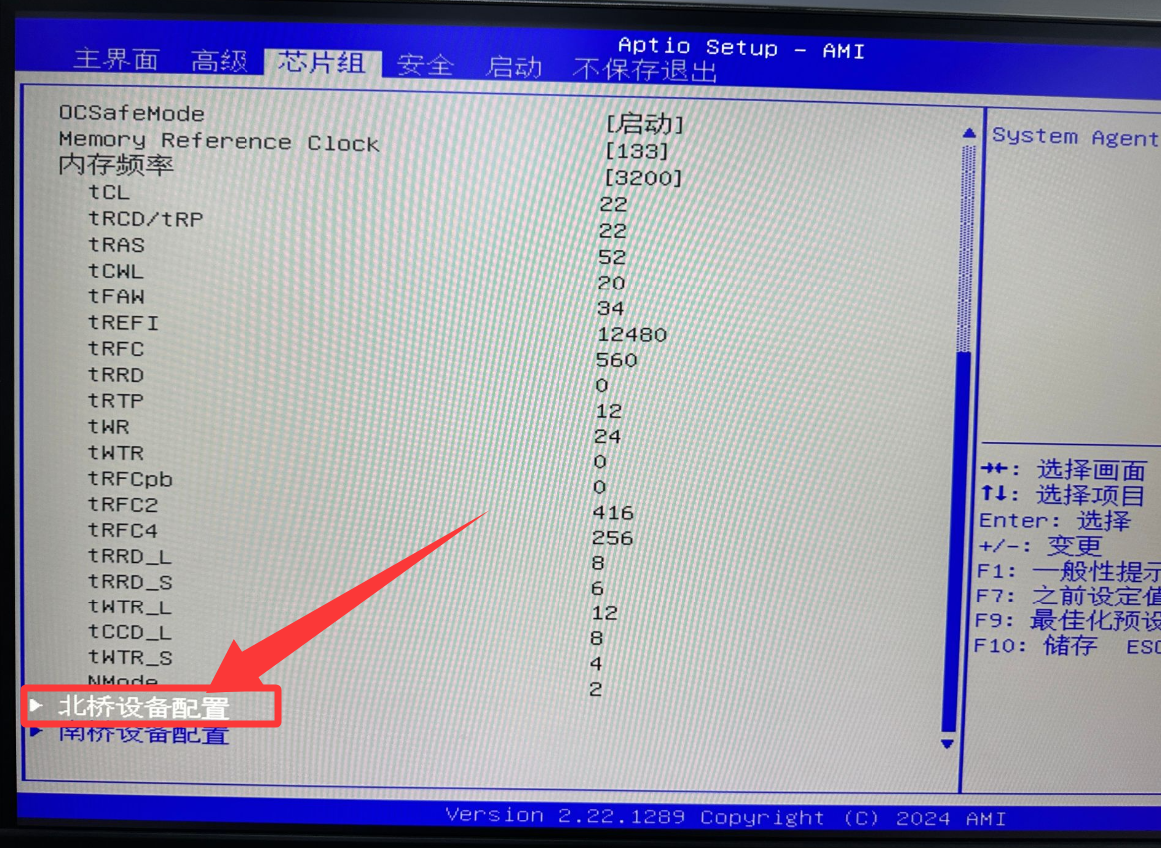 2.在“芯片组”栏目中,将光标移到最底部的选项后,按下“Crtl+F8”可出现隐藏的设置选项,此时我们选择下图所指的“北桥设备配置”选项回车进入。