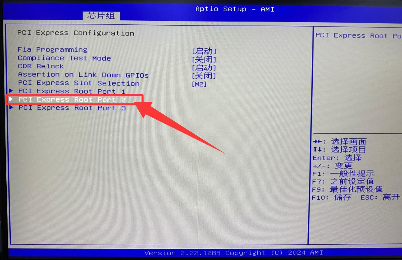 4.然后选择下图所指的“PCI Express root port 2”选项后,回车进入。