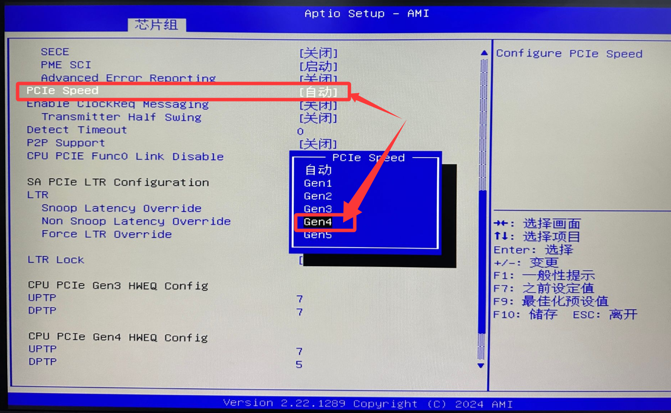5.进入后,找到下图所圈的“PCIE Speed”选项并按回车,在弹出的窗口中选择“Gen4”,然后按F10保存退出即可~