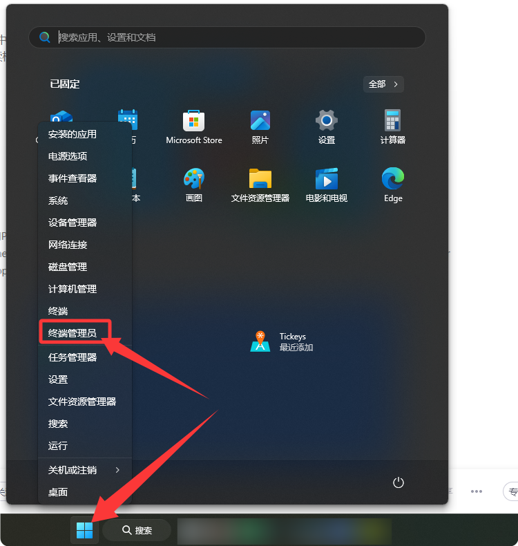 1.右键点击任务栏上的win图标,选择“终端管理员”选项进入。