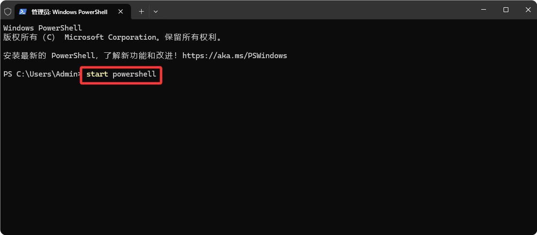 2.在出现的窗口中输入(或直接复制)“ start powershell”后按回车键,会出现一个新的背景为蓝色的界面。
