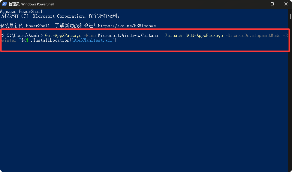 3.然后复制“Get-AppXPackage -Name Microsoft.Windows.Cortana | Foreach {Add-AppxPackage -DisableDevelopmentMode -Register "$($_.InstallLocation)\AppXManifest.xml"}”这段代码粘贴到蓝色界背景界面的终端模式中,并按回车,然后重启电脑即可~