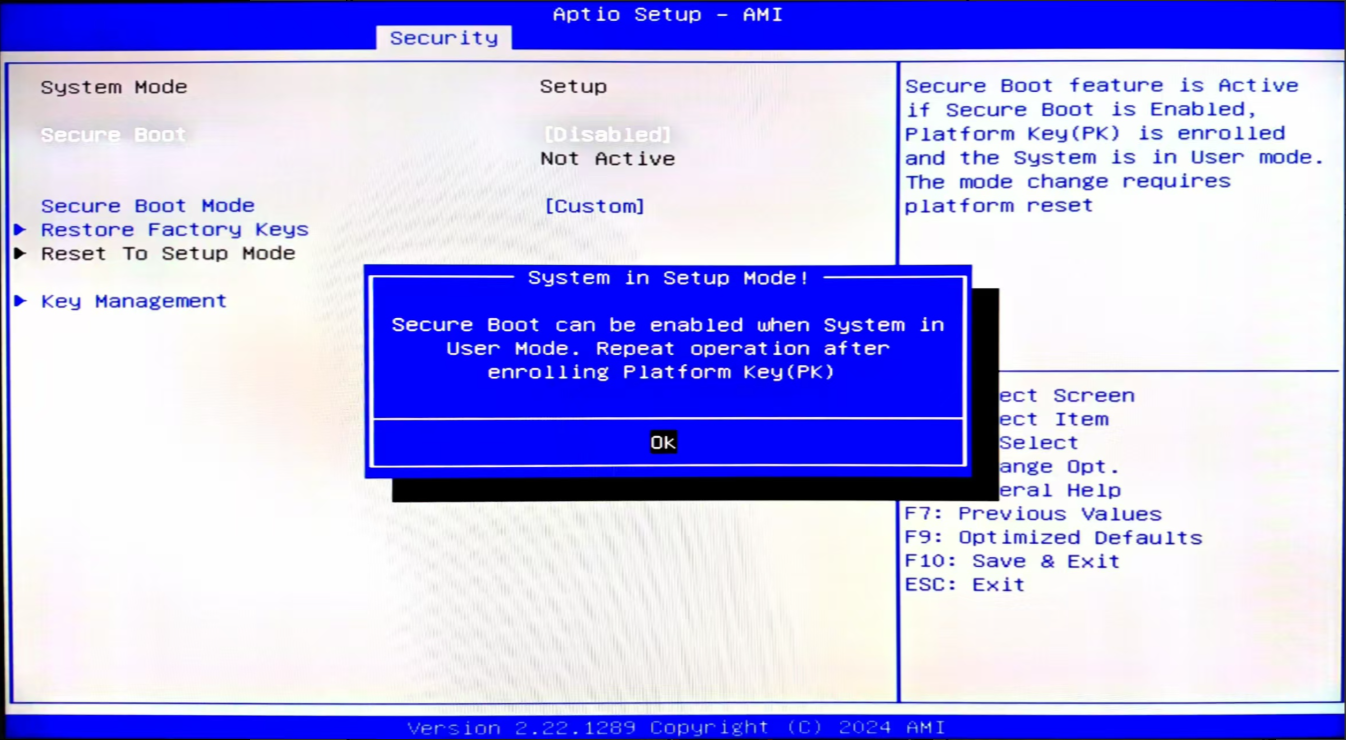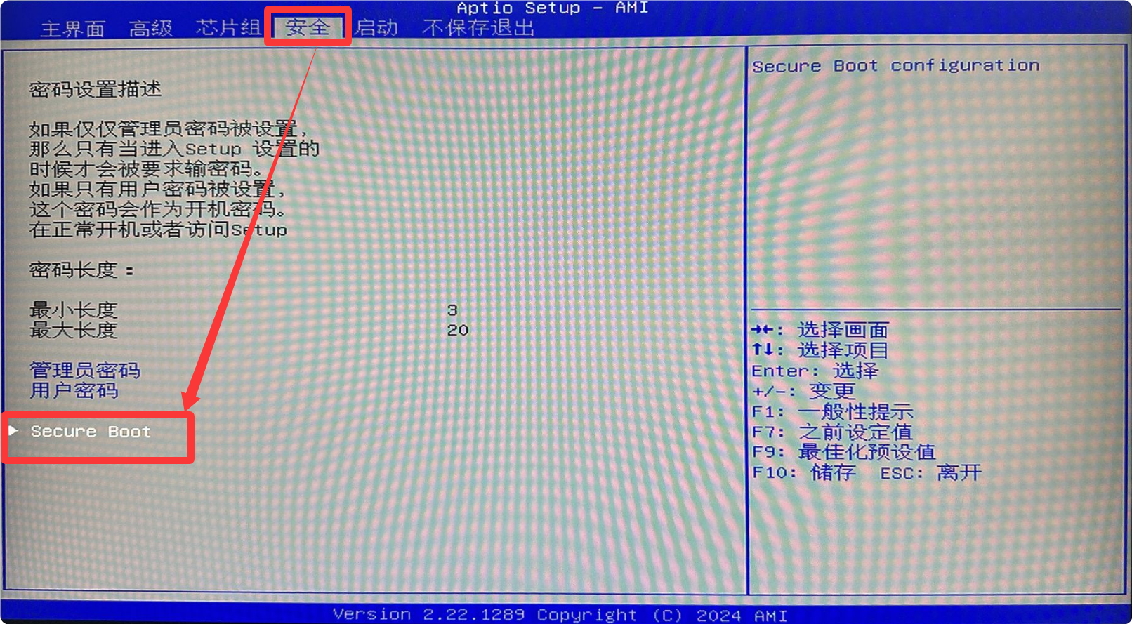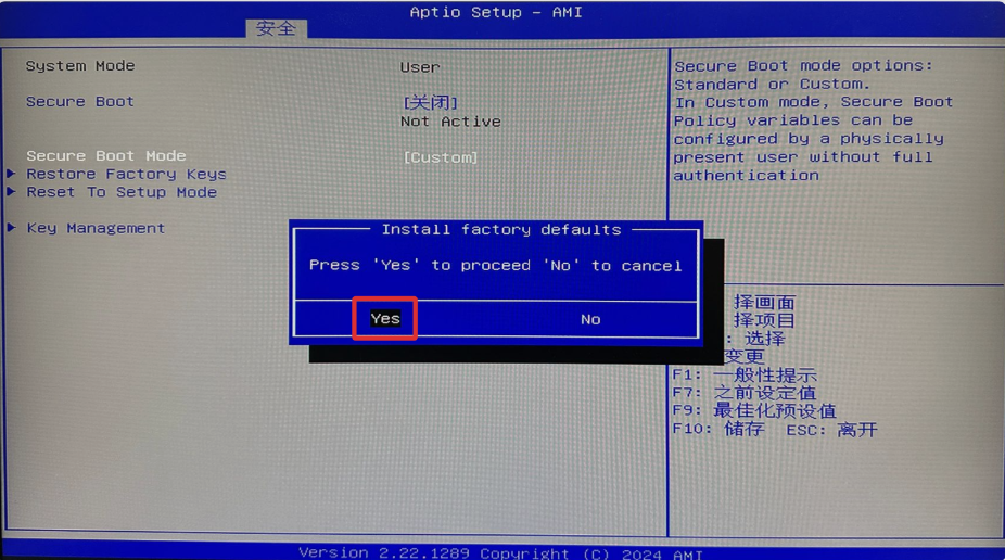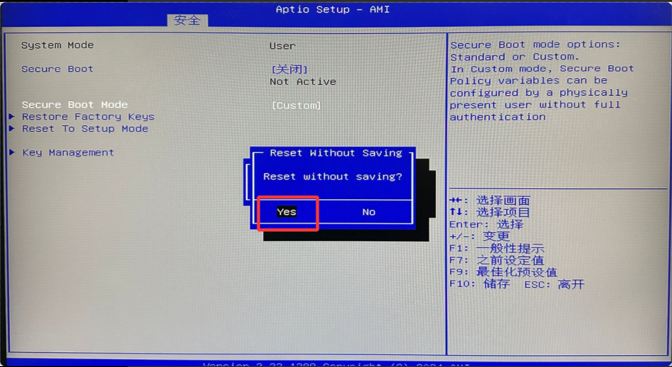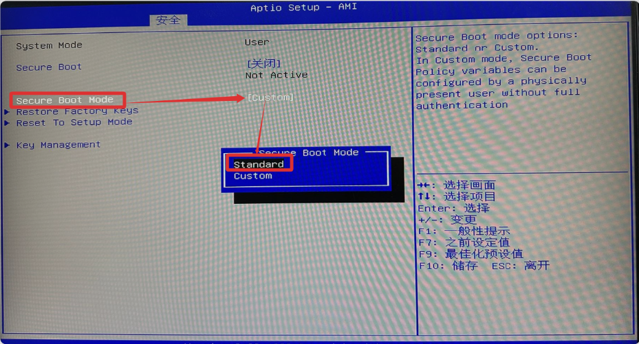 1.可以在bios中的“安全”栏目中的“secure Boot Mode”设置改成“Standard”的选项后按回车键。