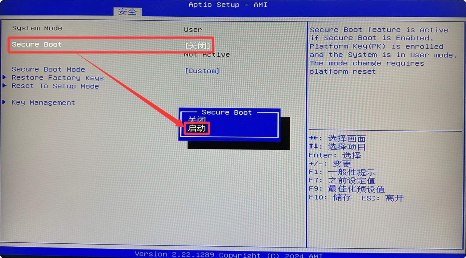 4.然后我们再次进BIOS,将“Secure Boot”再次选择“启动”。然后将先前的“Secure Boot Mode”设置改回“Custom”后,按F10键,然后按回车键保存退出即可~~