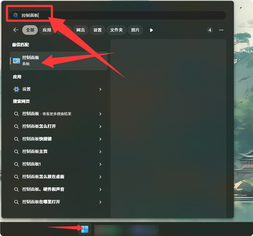 1.鼠标点击底部任务栏,在搜索窗口中输入“控制面板”,选择控制面板进入。