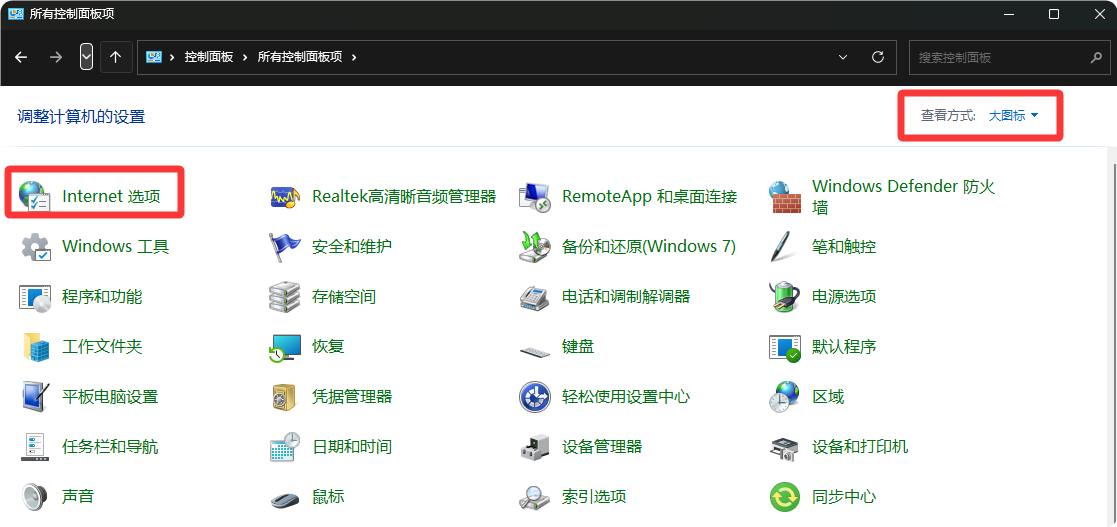 2进入控制面板界面之后,将右上方的查看方式选择“大图标”,然后在界面中选择“lnternet选项”进入。