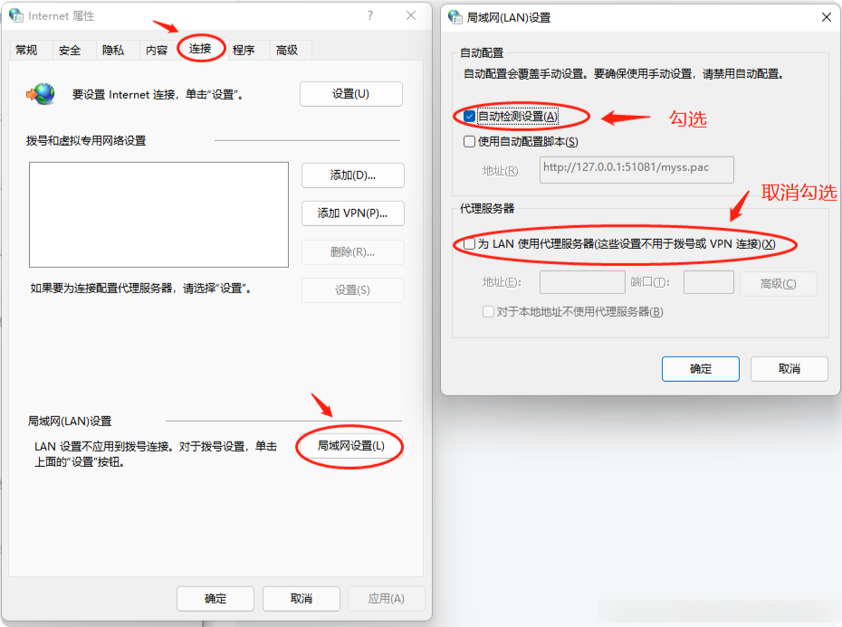 3.在“lnternet选项”中选择“连接”栏目,然后点击下方的“局域网设置”,在弹出的界面勾选“自动检测设置”,并将下方的“为LAN使用代理服务器”选项取消勾选,然后点击确定重启电脑即可。