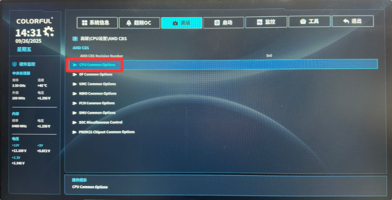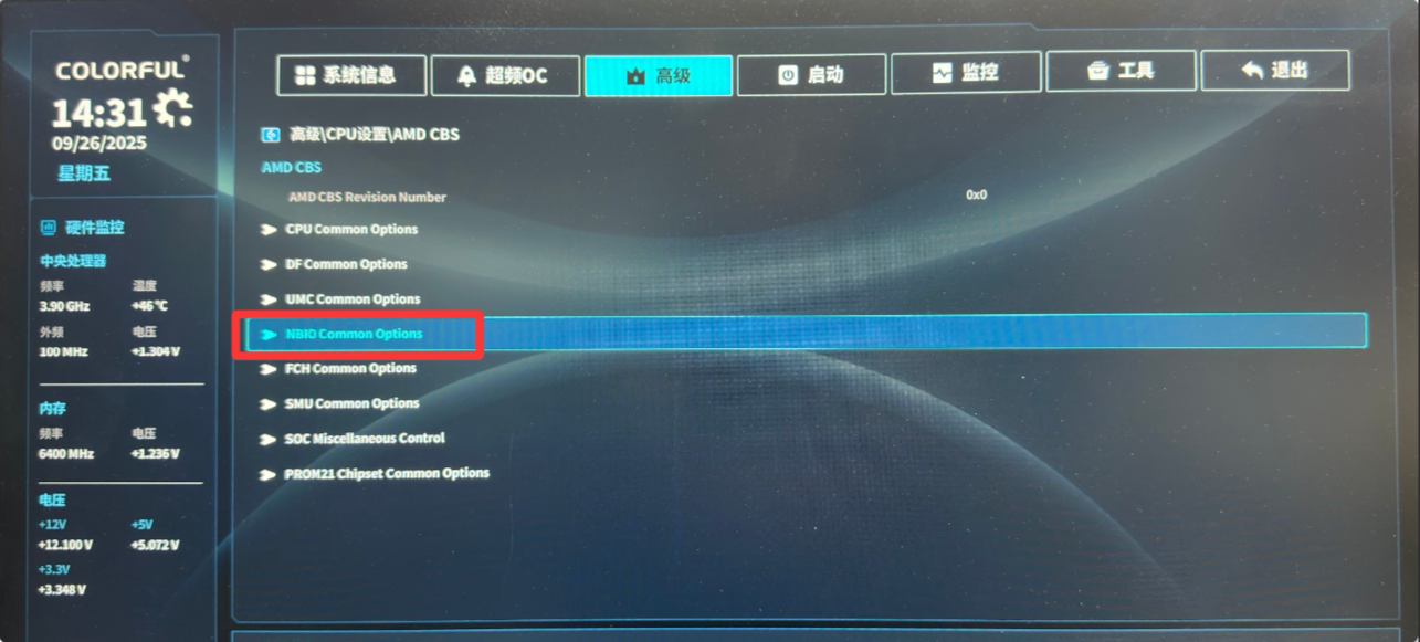 然后回退一步到“AMD CBS”选项中,将“NBIO Common Options”选项进入。