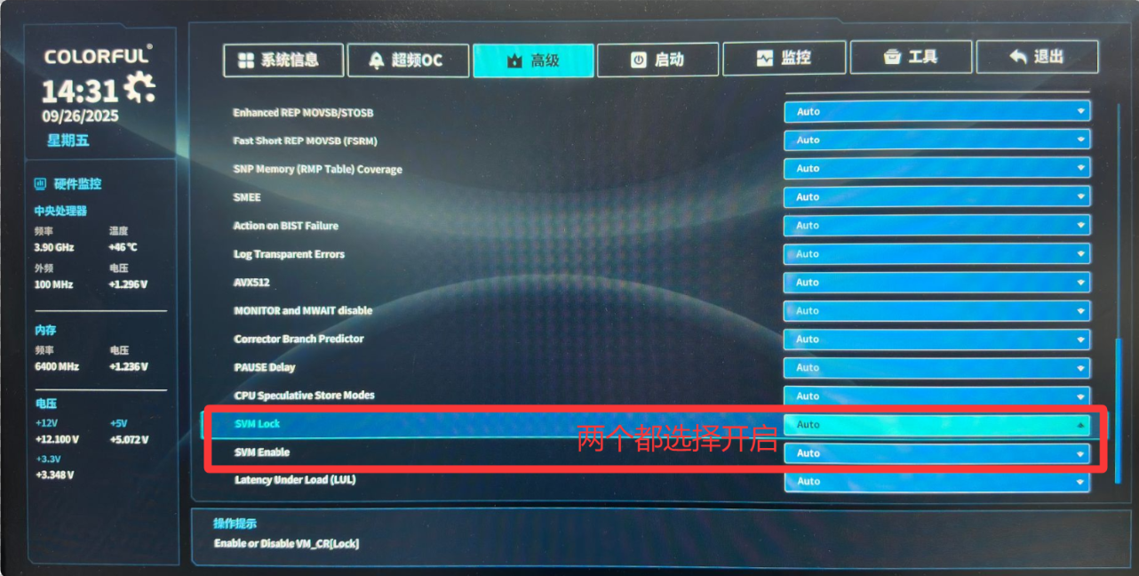 下拉到最底部,将所圈的“SVM Lock”和“SVM Enable”选项都选择“开启”。