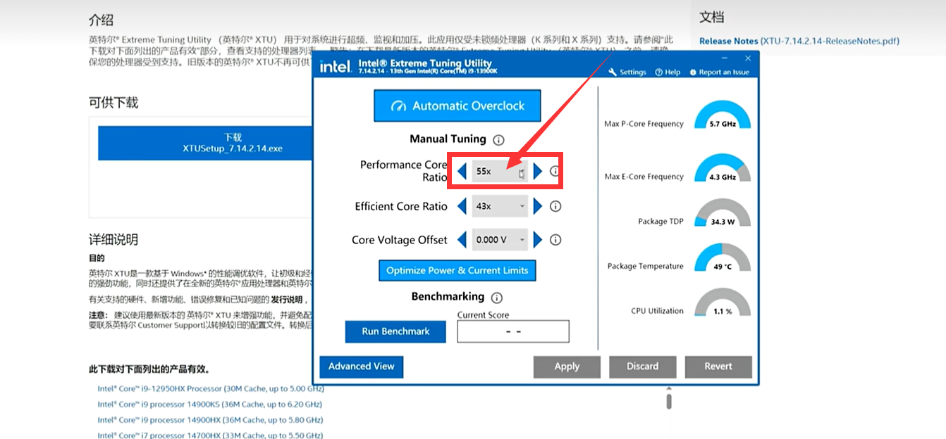 1.使用上述链接下载英特尔的XTU软件安装,重启电脑后双击打开XTU软件,打开后将下述箭头所指的地方点击。