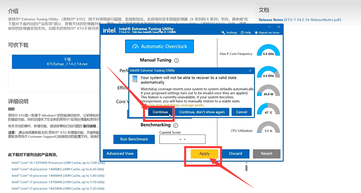 3.然后点击箭头所指的黄色“Apply”按钮,出现弹窗提示后,点击箭头指的“Continue”选项。然后再次点击黄色的"Apply"按钮,此时该Apply按钮变成灰色,代表设置完毕。设置完毕之后直接进入游戏即可~(说明XTU设置之后每次重启该设置都会自动还原)