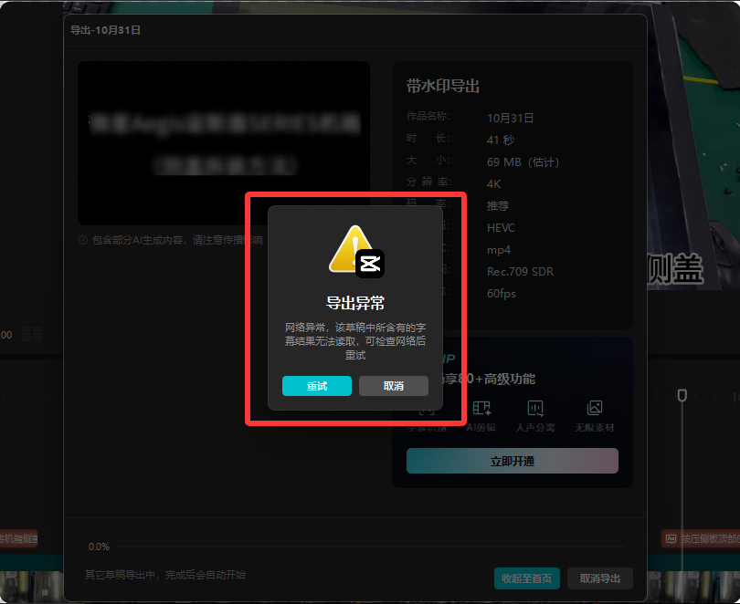 在剪辑完视频导出时,出现“导出异常”的提示“网络异常,该草稿中所含的字幕结果无法读取”的情况。尝试去掉字幕或更换其他的各种方式导出均会提示这个,且自己网络并无任何异常。