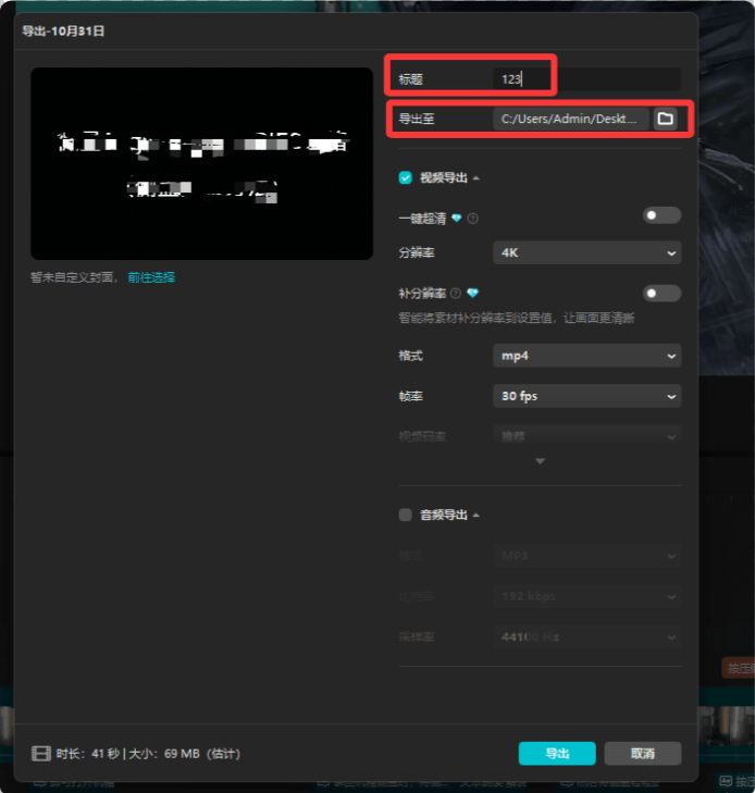 2.随即我们在剪映里面选择导出视频,视频标题改为123,然后导出的地方选择为桌面,