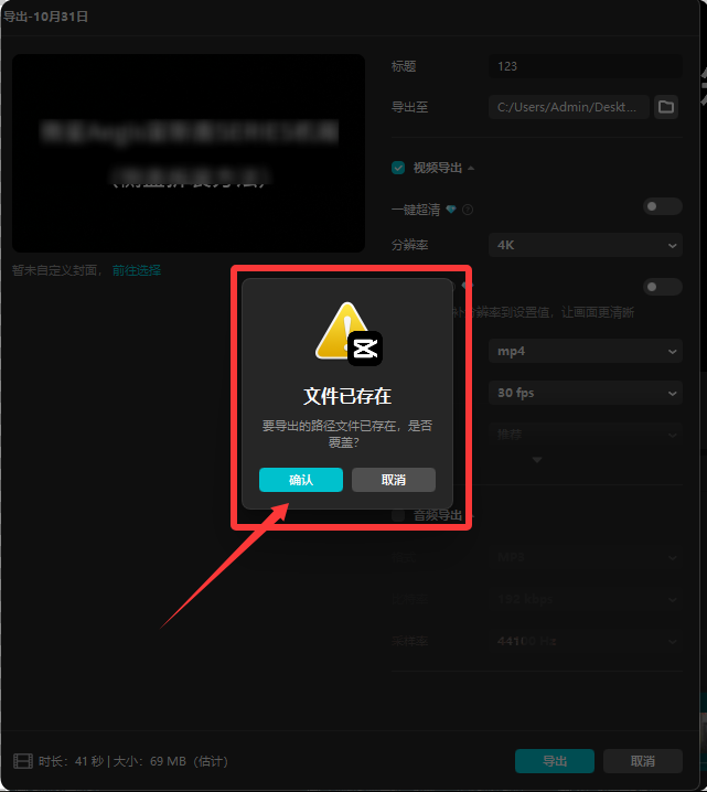 3.然后会出现下方“文件已存在”的提示,我们直接点击确认,然后就可以导出了。(该方法若不行,则建议参考方法2)