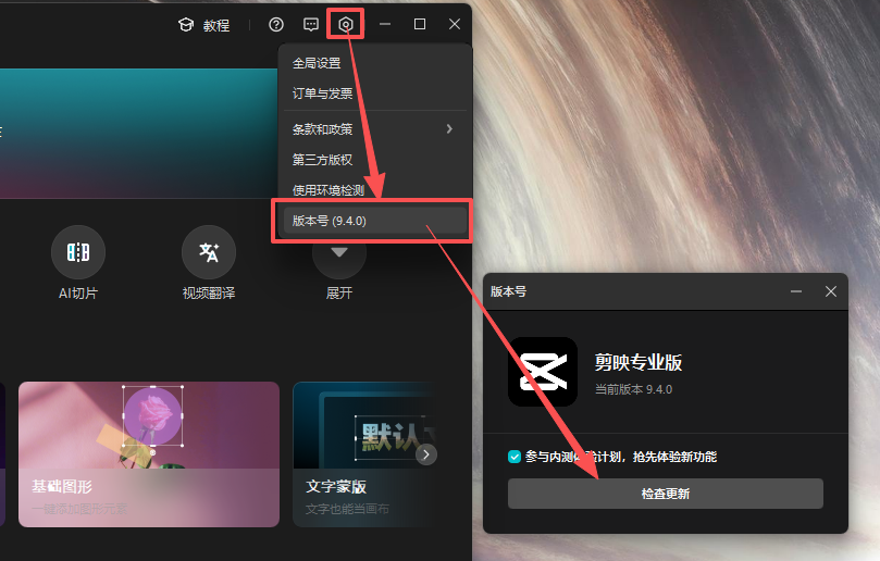 1. 点击剪映主页右上角的“齿轮”图标,选择最底部的“版本号”进入后检查一下更新可以尝试更新新版本,或勾选更新内测版本(如果有),更新完毕之后即可解决。(亲测正式版用该方法解决了~)
