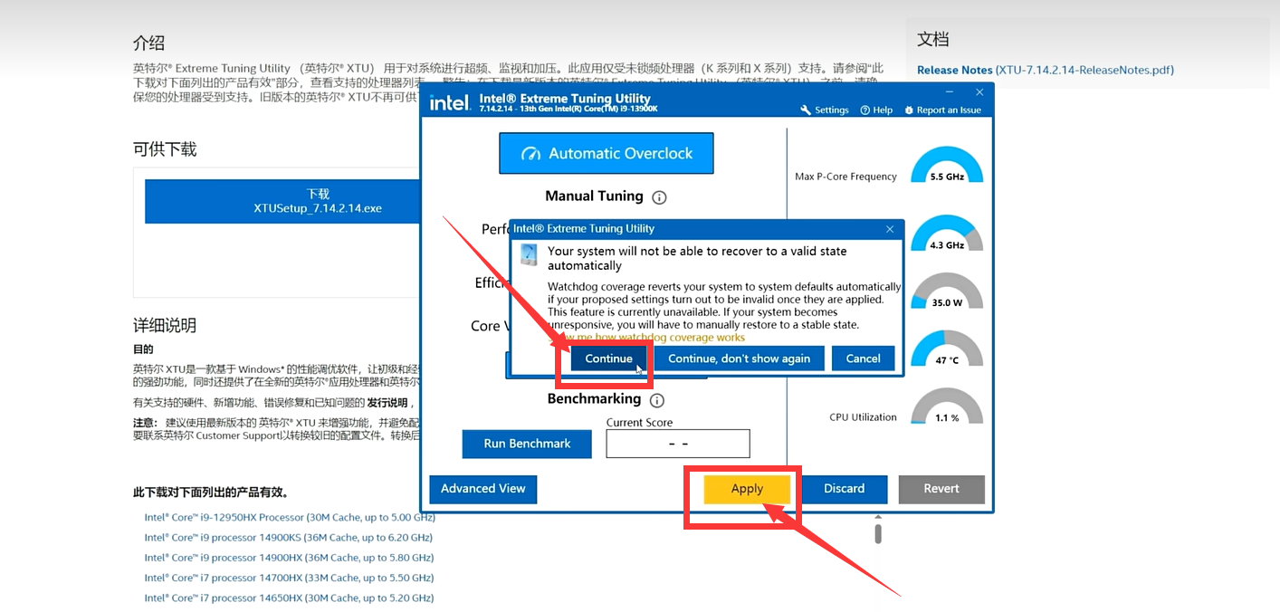 3.然后点击箭头所指的黄色“Apply”按钮,出现弹窗提示后,点击箭头指的“Continue”选项。然后再次点击黄色的"Apply"按钮,此时该Apply按钮变成灰色,代表设置完毕。设置完毕之后直接安装显卡驱动即可~(说明XTU设置之后每次重启该设置都会自动还原)