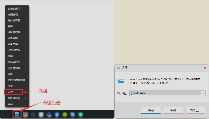 1、鼠标右键点击任务栏开始图标,选择“运行”,在出现的窗口输入“gpedit.msc”命令,打开本地组策略编辑器界面。
