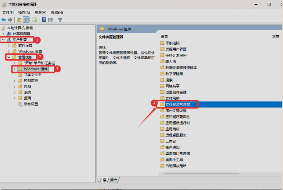 2、然后依次点击展开“用户配置>管理模版> Windows组件>文件资源管理器”进入。