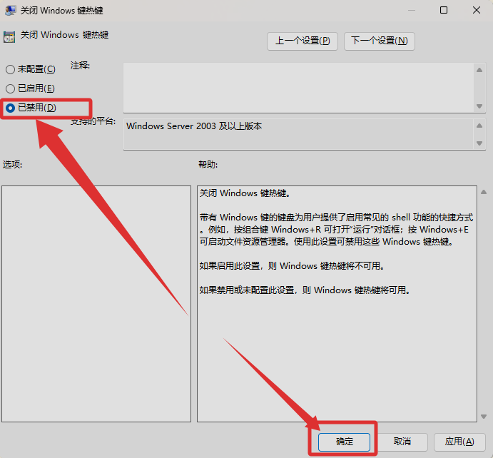 4、在出现的窗口中,选择勾选“未配置”或“已禁用”,再点击应用确定即可。(若功能失效的时候进来查看发现已经是未配置/已禁用的选项了,则重新设置一遍再尝试功能是否恢复了~)
