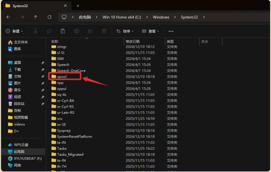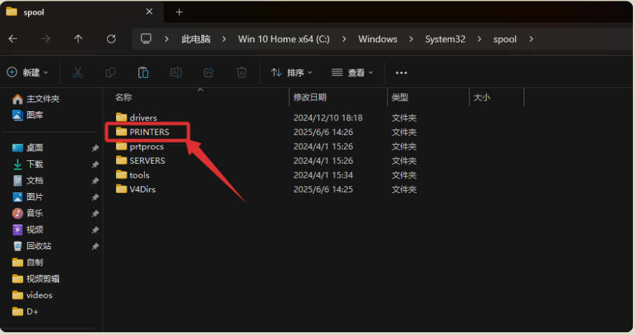 删除下述“PRINTERS”文件夹内所有的文件后,重启电脑即可~(注意是删除文件夹内的文件,不是直接删除该文件夹~)