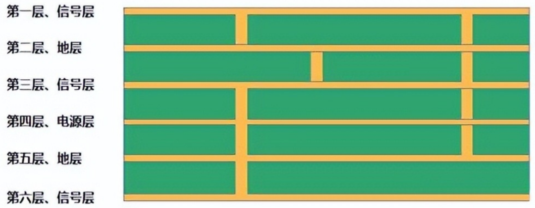 ● 混合层:多存在于 6‑8 层板中,常见 “Signal‑GND‑Signal‑PWR‑GND‑Signal” 的交替排列,这种 “信号‑地‑电源‑信号” 结构被称为“信号‑地‑电源‑信号三明治”,是高速 PCB 的最为经典一项设计。