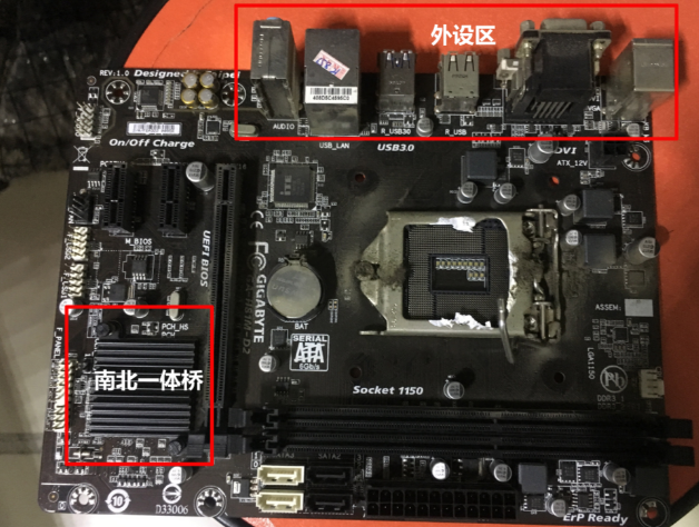 所以,在传统的主板上,它俩属于是核心硬件之一了,而且要知道早期的制造工艺上相对粗糙,晶体管的数量相对偏少,因此曾经的处理器集成度较低,必须要由主板芯片组来承担大量功能。然而芯片组就分为南桥芯片组和北桥芯片组两部分,其中的北桥负责CPU与内存的数据交换、图形处理、CPU与PCIE数据交换;南桥则负责系统的输入输出功能。它们具体位置可参考下图: