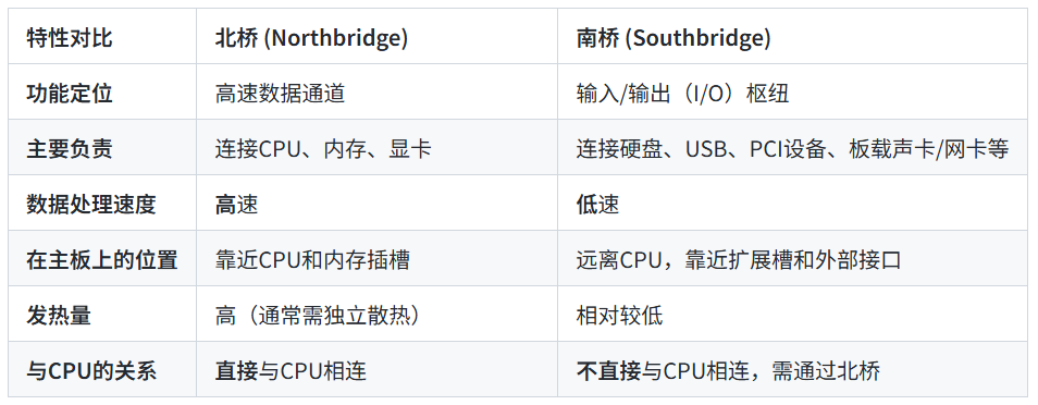 它们之间的一快一慢,一内一外,协同工作,却确保了电脑内部数据的有序和高效传输。虽然它们的物理上在现代平台上已被高度集成了,但它们的功能划分仍然是了解电脑硬件架构的重要基础之一。