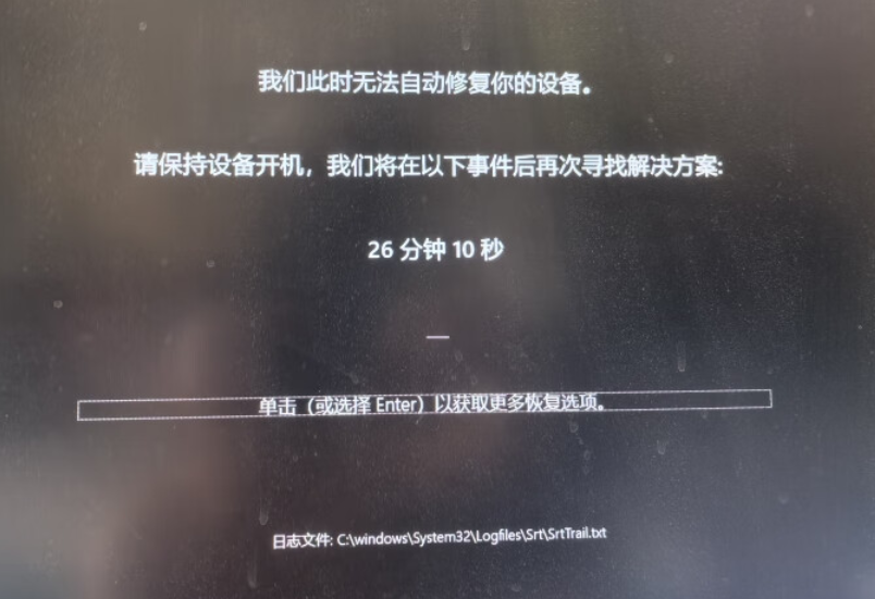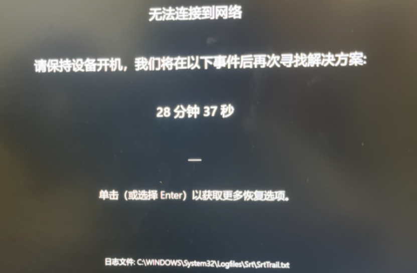 机器未正常启动或强制关机以及某次开机突然出现如下报错,显示无法连接到网络,请保持设备开机,我们将在以下事件后再次寻找解决方案,并出现倒计时30分钟,提示单击(或选择Enter)以获取更多恢复选项。