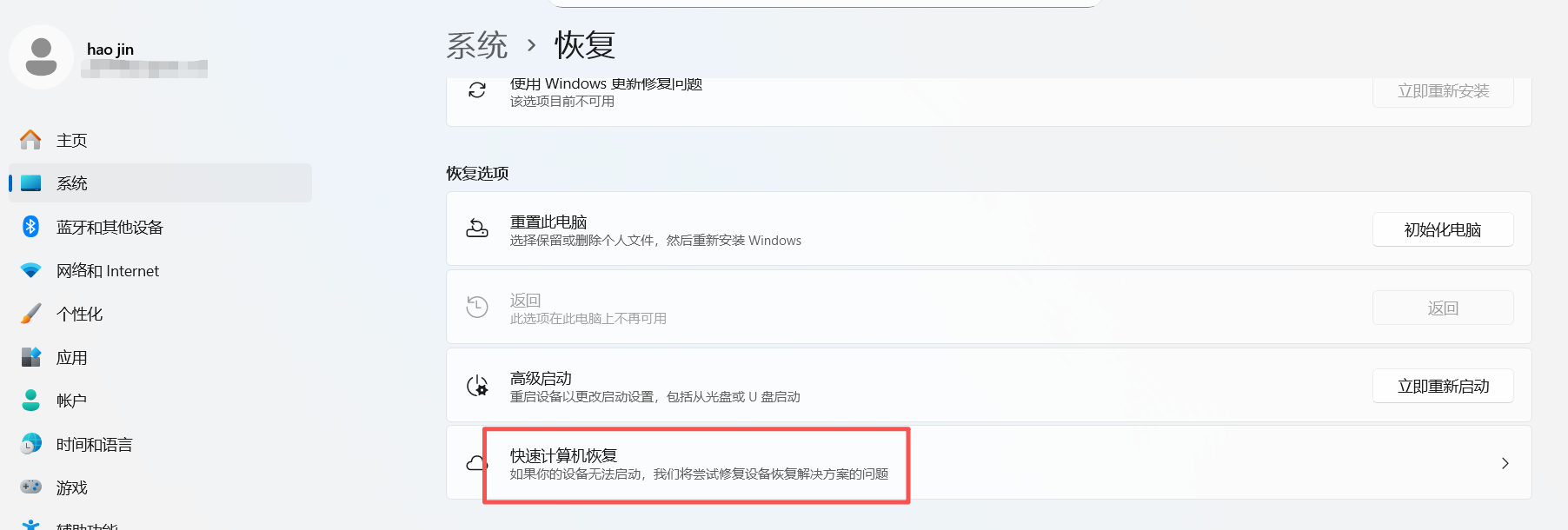 若需要关闭此提示页面,可进入系统后进入设置—恢复—快速计算机恢复—关闭即可~