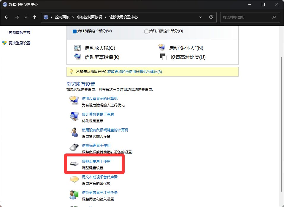 3.下拉找到“使用键盘更易于使用”的选项进入。