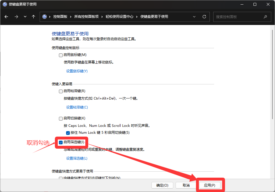 4.将图中“启用筛选键”的选项的勾选去掉,然后点击应用即可~