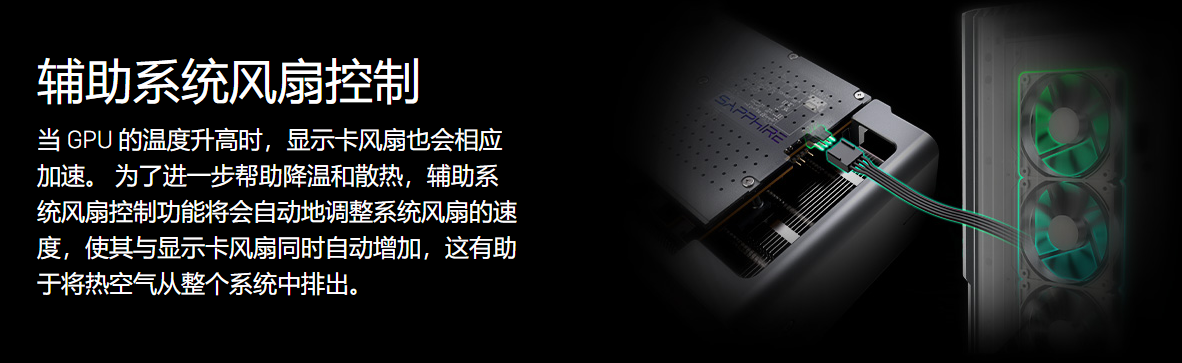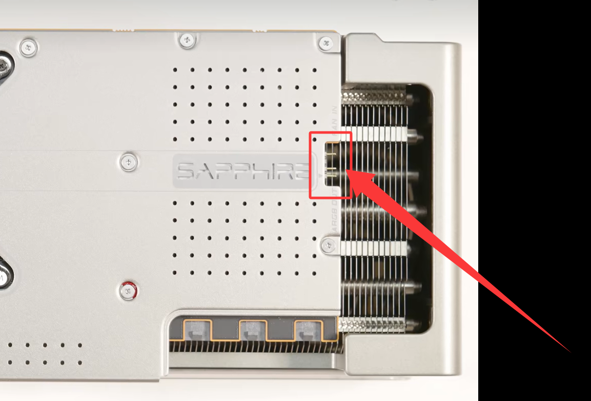 显卡尾部是有扩展接口的,分为ARGB外接灯控接口和外接散热风扇接口,可外接对应线材实现不同的功能。(部分显卡型号可能只有其中一个功能)