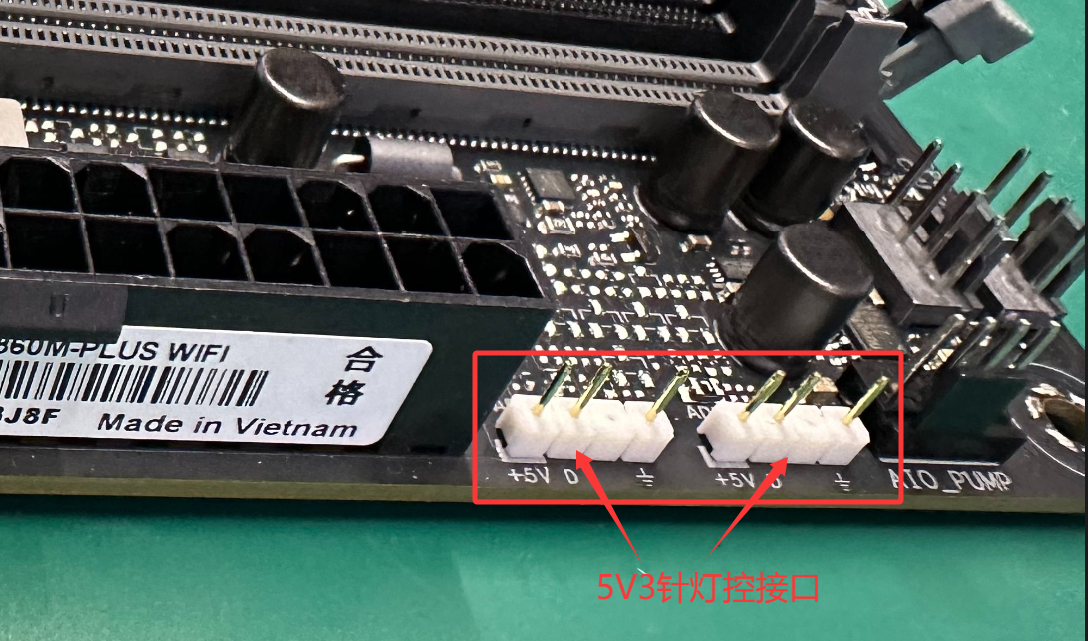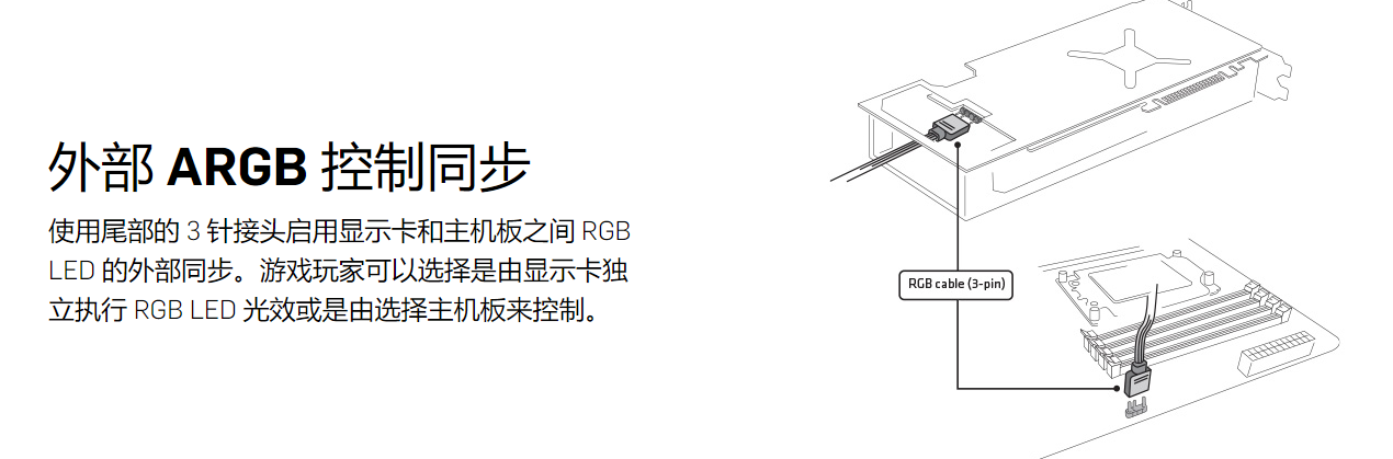 在显卡包装内找到5V3针的ARGB灯控线,将其一头插在下图所指的显卡灯控接口,另一头插在主板任意5V3针灯控接口即可(有集线器也可插集线器),然后可在显卡官网下载对应的灯控软件实现灯控功能。