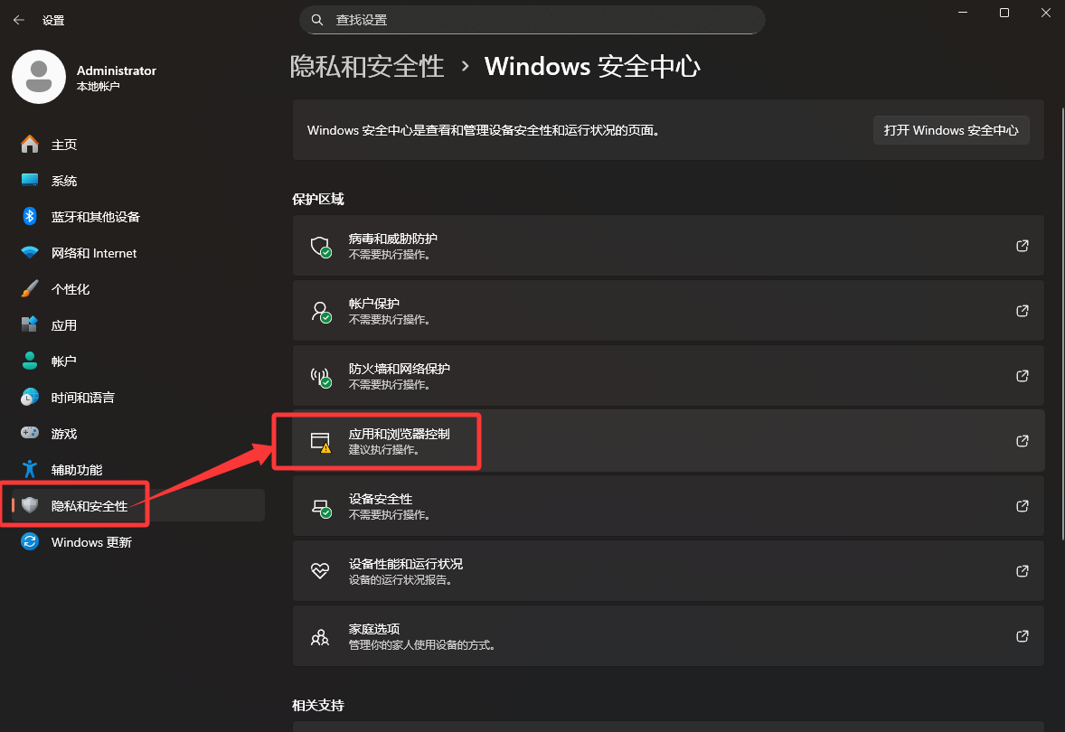 1.按键盘的“win+i”键,切换出设置界面,在设置界面的左侧找到“隐私和安全性”点击,然后在右侧下拉找到“应用和浏览器控制”的设置选项进入。