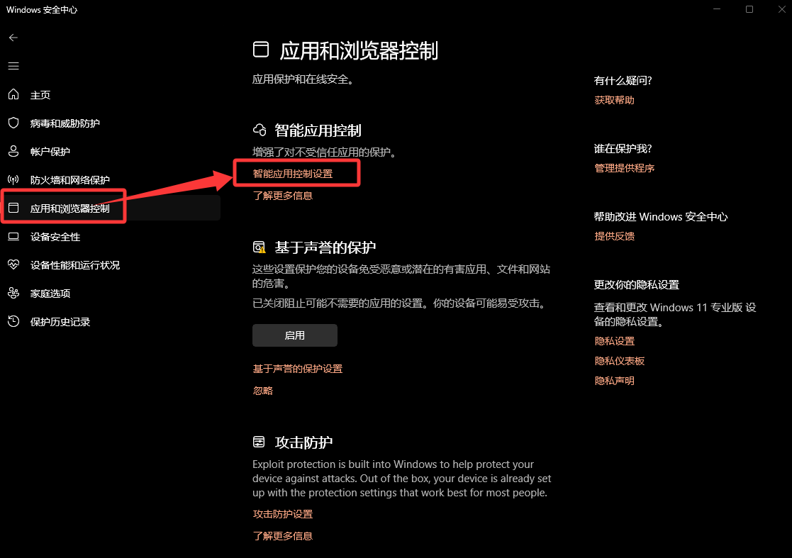 2.然后找到“智能应用控制”栏下方的“智能应用控制设置”选项进入。