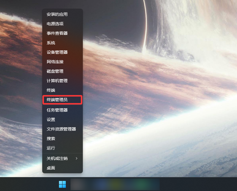 1.按“Win+X”快捷键,找到“终端管理员”选项打开。