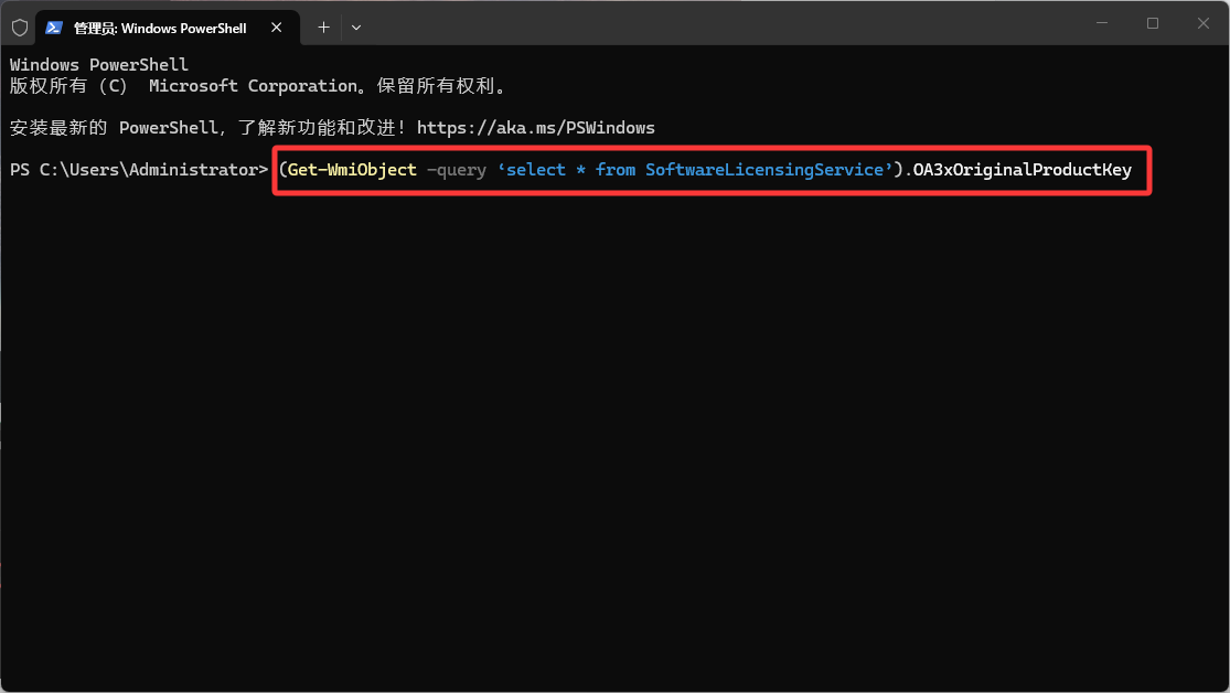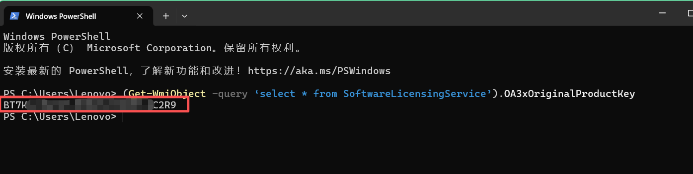 2.复制“(Get-WmiObject -query ‘select * from SoftwareLicensingService’).OA3xOriginalProductKey”后粘贴到下述窗口中,按回车即可查询主板密钥。(注意只复制标红的字符)