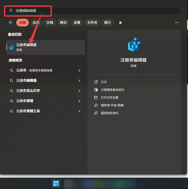 1.点击底部任务栏,在出现的搜索栏搜索“注册表”,在匹配到的“注册表编辑器”点击进入。