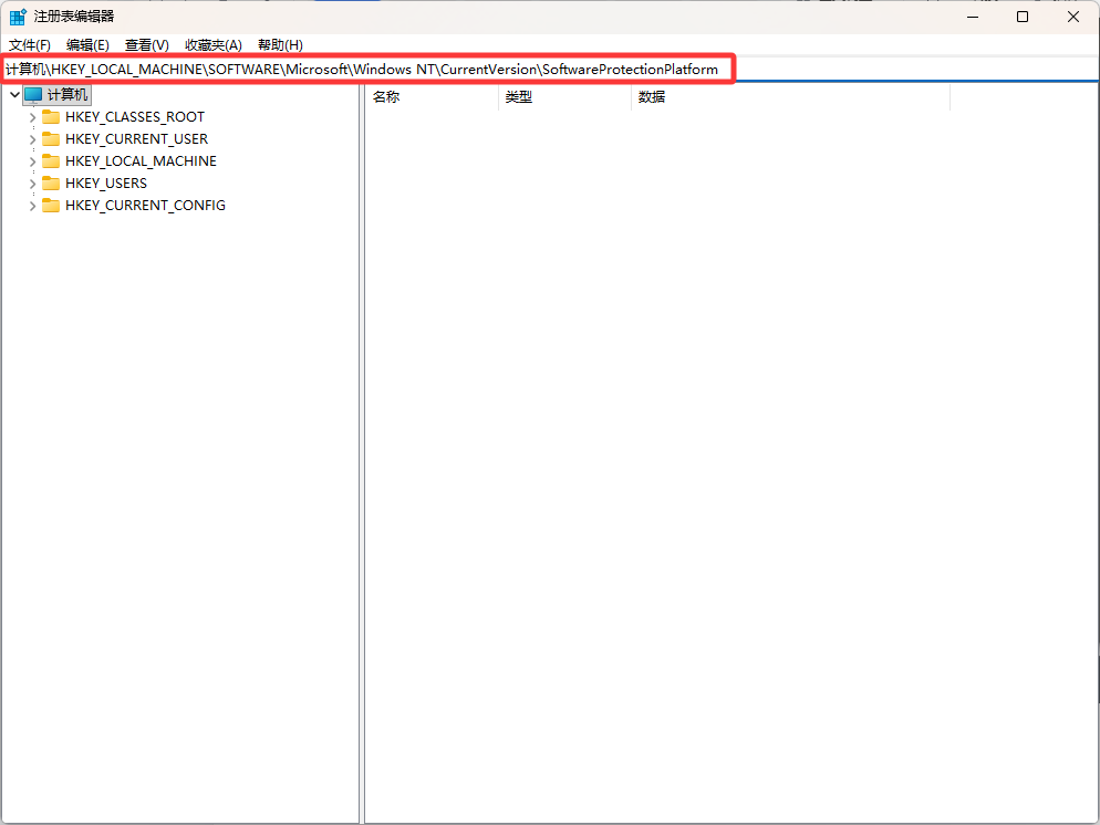 2.在注册表编辑器中所圈的位置粘贴“计算机\HKEY_LOCAL_MACHINE\SOFTWARE\Microsoft\Windows NT\CurrentVersion\SoftwareProtectionPlatform”这串路径后,按回车键直接跳转到目的地。