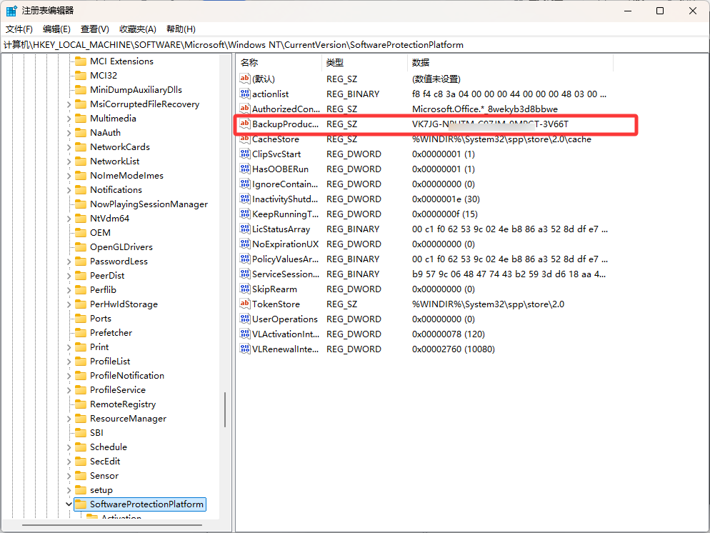 3.找到下图所圈名为“BackupProductKeyDefault”的选项,后面就是密钥了~