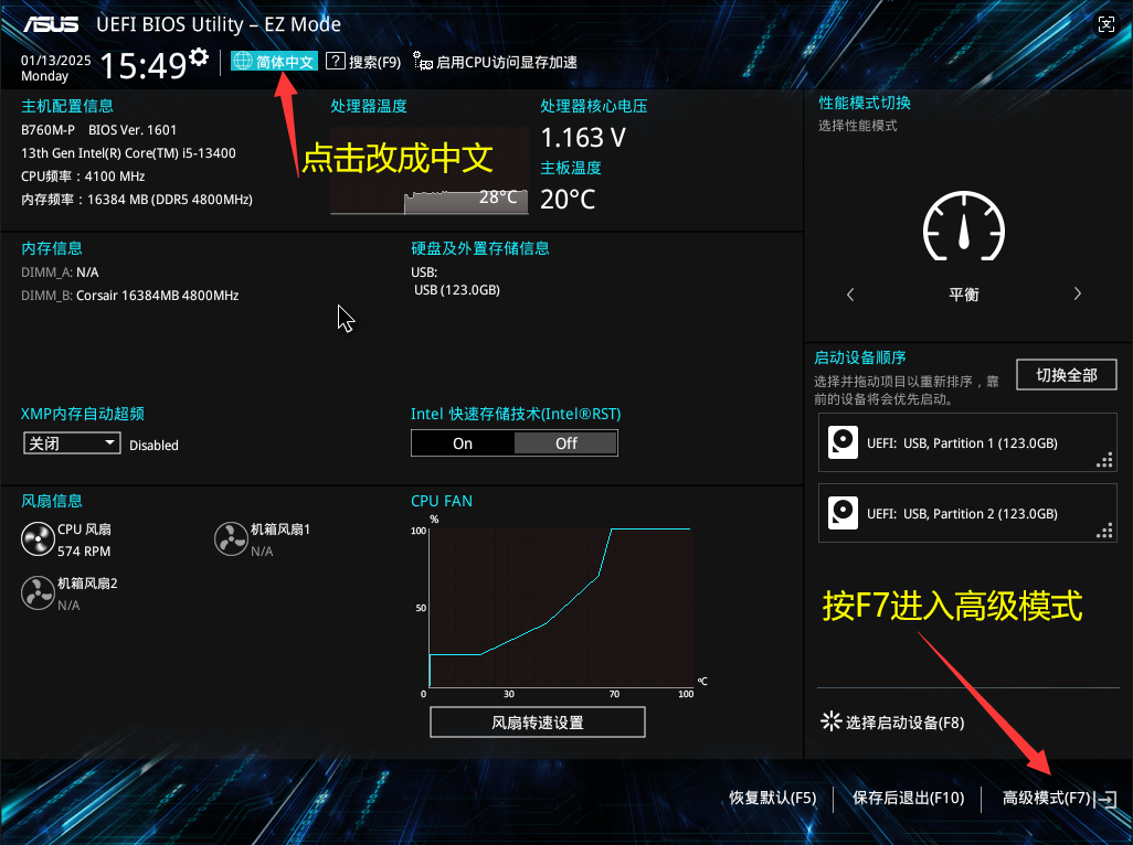4.在BIOS界面之后,点击下图中箭头所指,将语言改成简体中文,然后按一下键盘的“F7”进入高级模式。(如下图)
