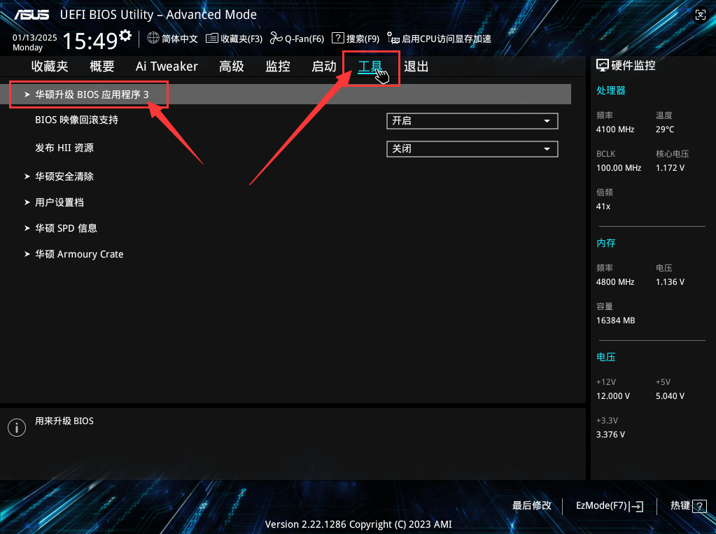 5.进入高级模式中,按下图选择“工具”类目,然后选择“华硕升级BIOS应用程序”后回车进入。(回车进入过程会黑屏十几秒左右,正常现象,耐心等候。)