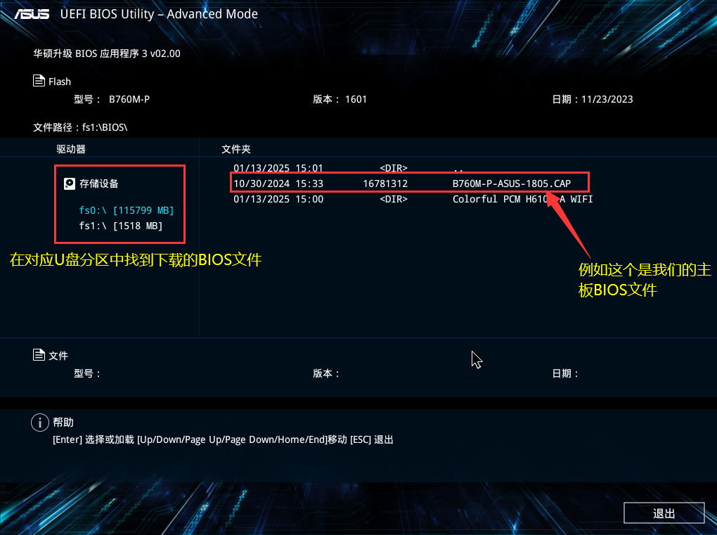 6.进入后,如下图在U盘对应的分区中找到自己下载的BIOS文件,(注意:BIOS文件一定要下载对型号,否则刷错了型号会导致主板无法开机而损坏。)