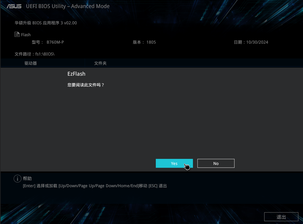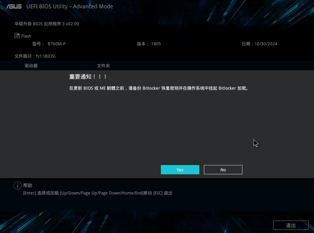 7.选择好对应BIOS文件之后,直接按“回车”,会提示下图中的提醒,直接选择“yes”即可。