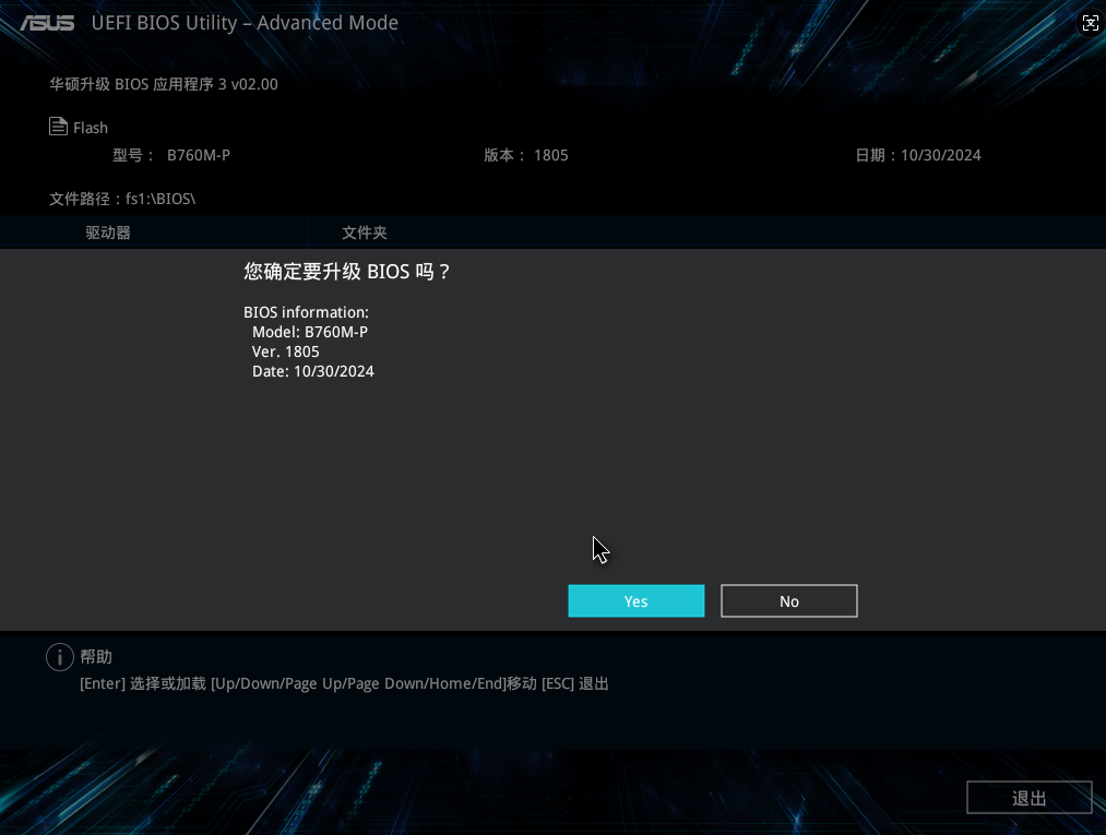 9.然后会再次出现下图中的提示“确定要升级BIOS吗?”,此时我们再次点击“yes”。