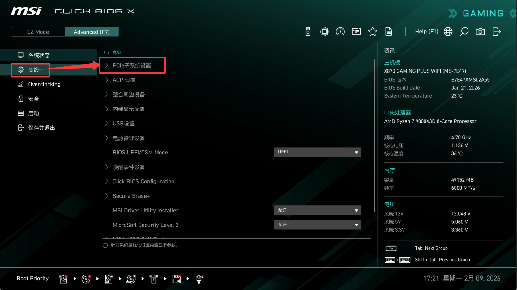 微星X870主板设置PCIE速率(Gen4)