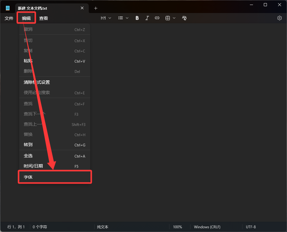 1.桌面空白处点击右键选择“新建文本文档”,然后打开该文档,点击顶部的“编辑”选项,然后选择“字体”选项