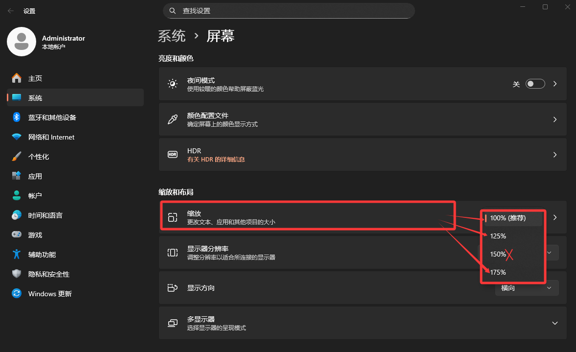 4.在“缩放和布局”选项中,将缩放更改为除150% 以外的其它比例即可。